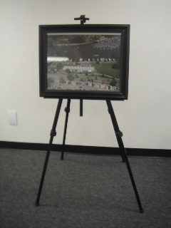Four legged, fully adjustable table top or floor height, black aluminum frame.